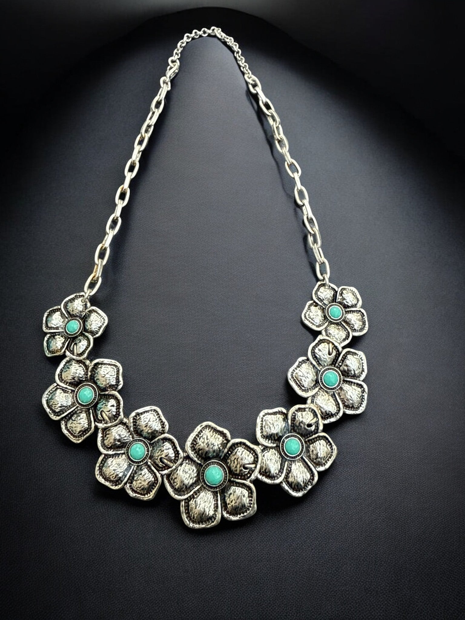 The Turquoise Bloom Statement Necklace is a bold yet feminine piece that brings vintage charm and southwestern flair together effortlessly. Featuring a cascading row of sculpted silver-tone floral medallions, each centered with a vibrant turquoise-hued stone, this necklace creates a striking collar effect that frames the neckline beautifully. The textured petals add depth and character, while the chunky silver chain provides balance and strength to the design. Eye-catching and expressive, this necklace is perfect for making a statement—whether paired with a simple tee, a flowy boho dress, or layered textures for a confident, standout look.