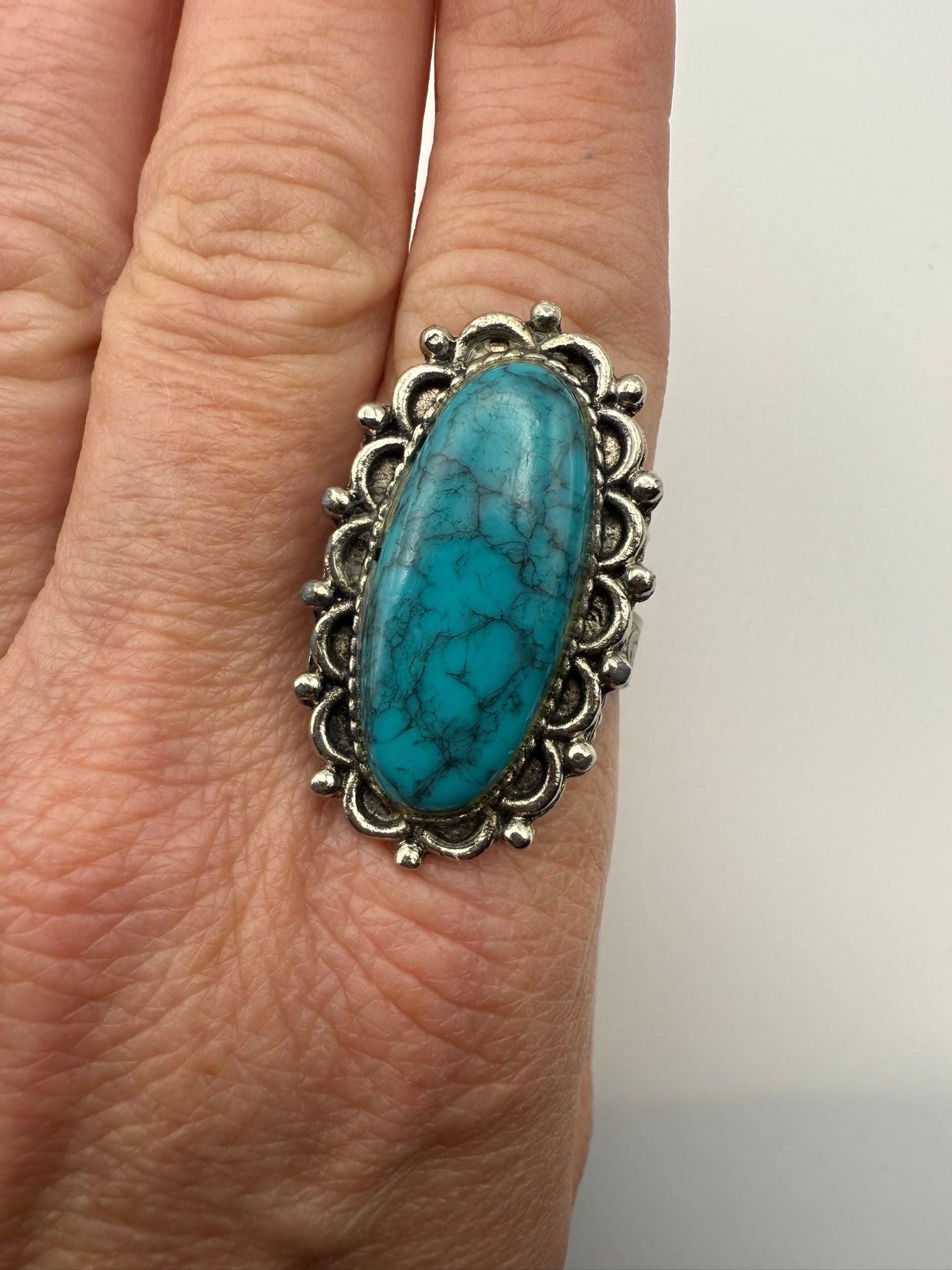 This striking statement ring showcases an elongated oval turquoise stone with natural veining, set in an ornate silver-tone filigree frame that adds vintage charm and depth. The bright blue hue brings a bold pop of color while the intricate scalloped detailing softens the look with an old-world, handcrafted feel. Eye-catching yet wearable, this ring is perfect for boho lovers who appreciate timeless design with a touch of Southwestern influence.