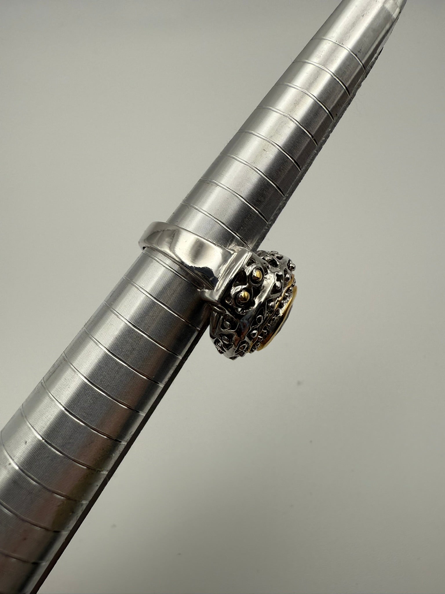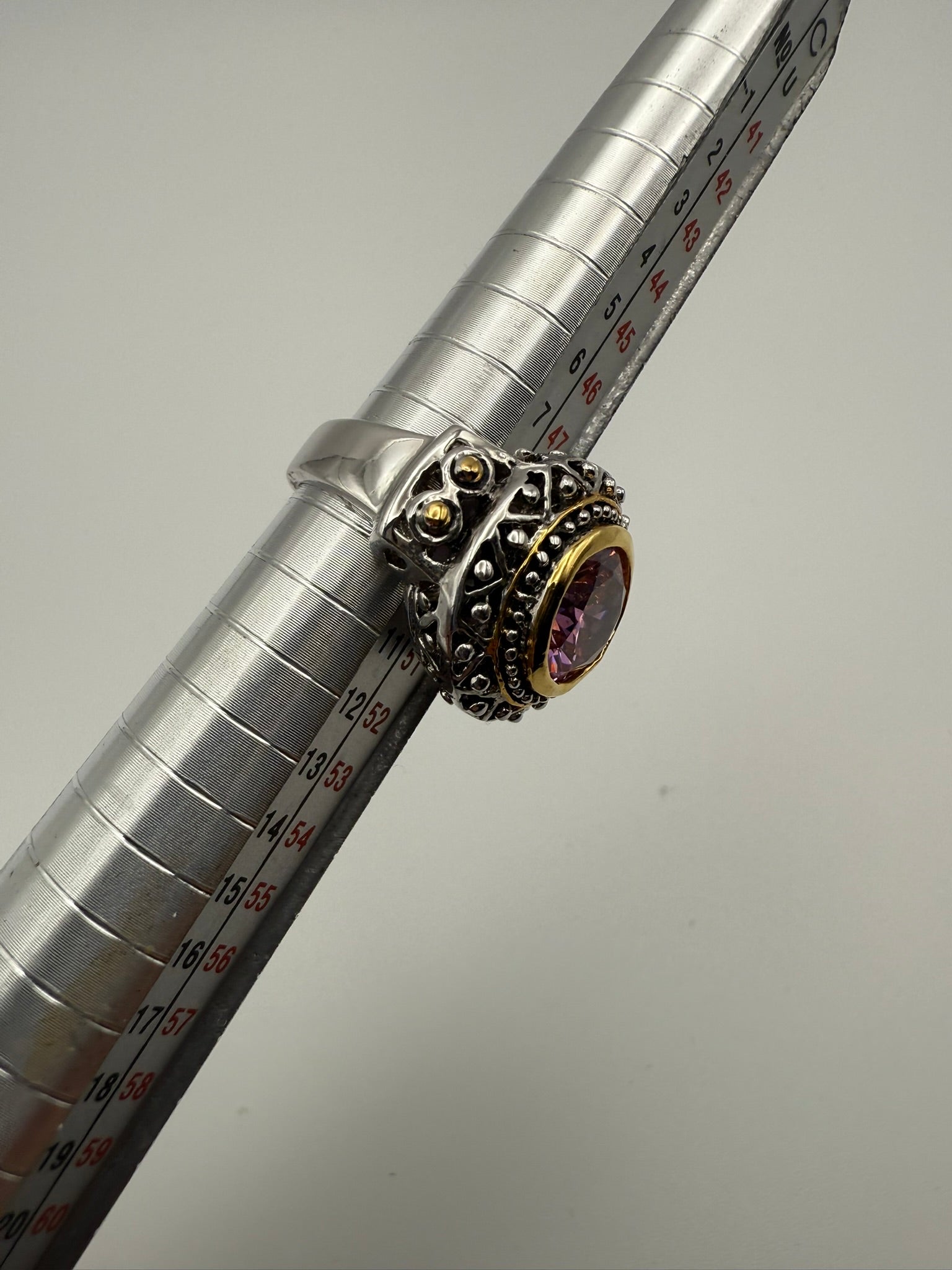 This two-tone ring features a faceted pink crystal set in a gold-tone bezel, surrounded by an oxidized silver-tone frame with intricate dotted and textured detailing. The contrast of warm gold accents against darker silver tones gives the ring depth and a subtle vintage feel while remaining easy to wear. Designed as a standard ring, this piece pairs beautifully with mixed metals and adds a refined pop of color to everyday styling.